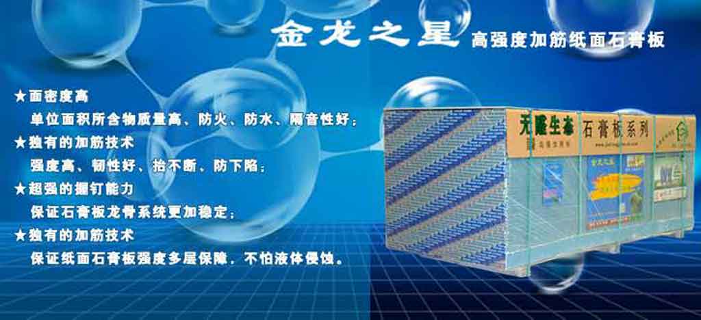 “金龍之星”加筋高強紙面石膏板,采用淡藍色紙面作為護面紙,選用純天然石膏為原來,在傳統工藝上,利用專利技術加入高彈性非金屬纖維網格布,耐久、耐水、不變形。