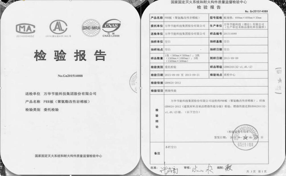 (1)PRR保溫板以巖棉為保溫材料,防火性能好,經天津消防檢測燃燒性能為A級;