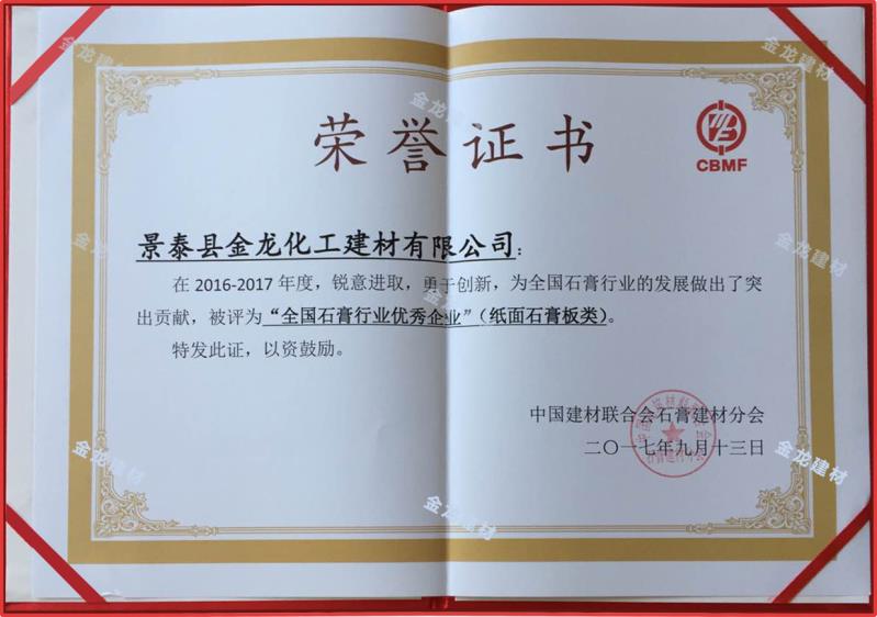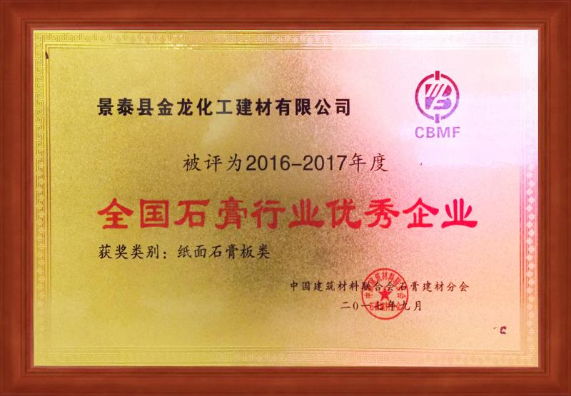 金龍公司作為一家專業(yè)生產(chǎn)、銷售高品質(zhì)天然礦產(chǎn)石膏系列制品的建材企業(yè),自2001年成立以來,始終堅(jiān)持“安全、環(huán)保、綠色、高效”的發(fā)展戰(zhàn)略,多年了以高質(zhì)量的產(chǎn)品和完善的售后服務(wù),樹立了良好的企業(yè)形象和信譽(yù)。在2016-2017年度,銳意進(jìn)取,勇于創(chuàng)新,為全國石膏行業(yè)的發(fā)展做出了突出貢獻(xiàn),被評為“全國石膏行業(yè)優(yōu)秀企業(yè)”榮譽(yù)稱號。